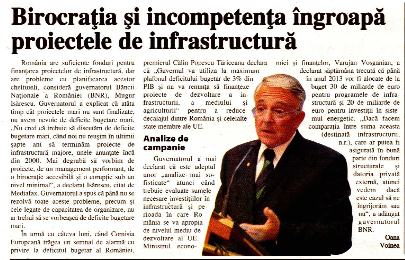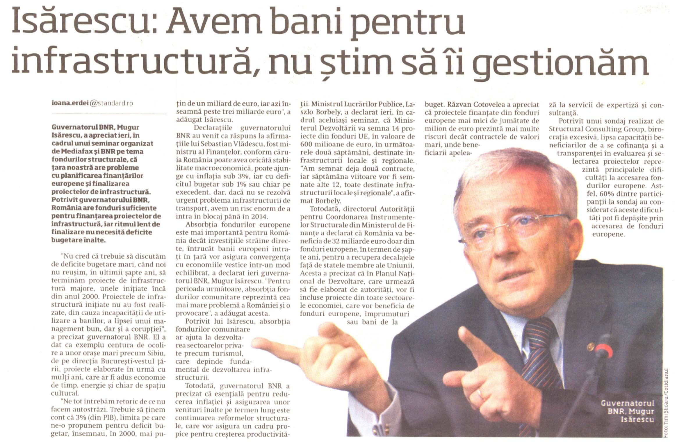 STANDARD.ro (24 iunie 2008)Romania nu are probleme cu finantarea proiectelor de infrastructura, ci cu planificarea acestor cheltuieli, inclusiv prin bugete multianuale, a declarat marti guvernatorul Bancii Nationale a Romaniei (BNR), Mugur Isarescu.